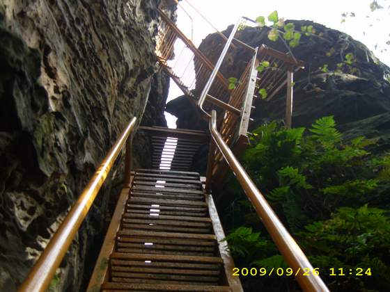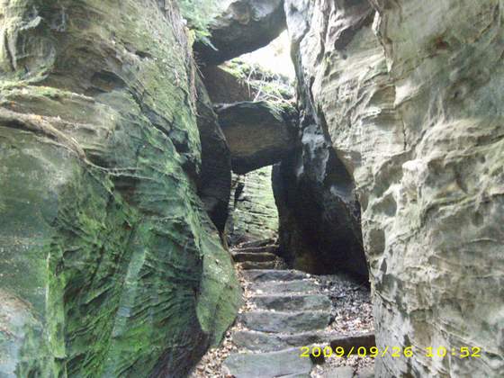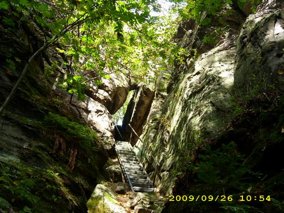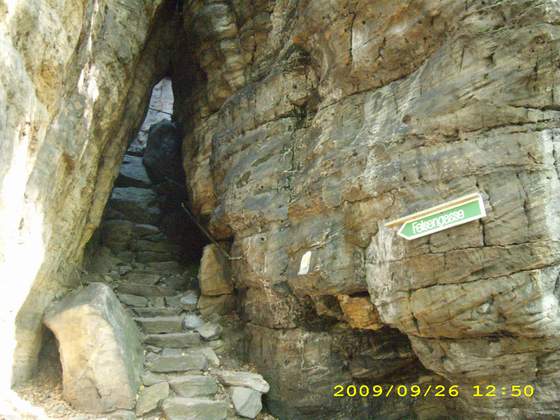 Der romantische Aufstieg führt bald zwischen und unter den Felsen über Stufen nach oben. Der