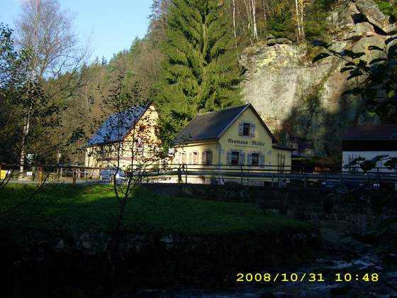 Parkplatz an der Neumannmühle im Kirnitzschtal. Wegen der vielen Wanderer, die den Parkplatz ansteuern, sollte man zeitig dort sein. An der Neumannmühle kann das technische Denkmal der Mühle besichtigt werden. Von dieser Mühle
