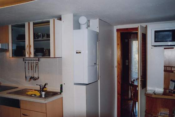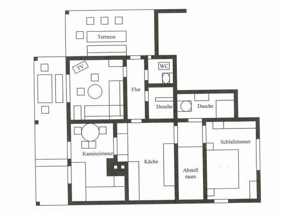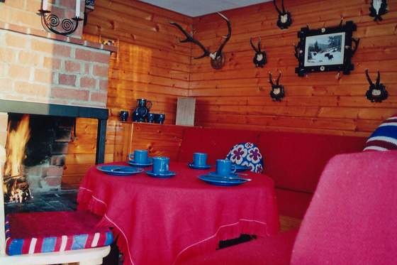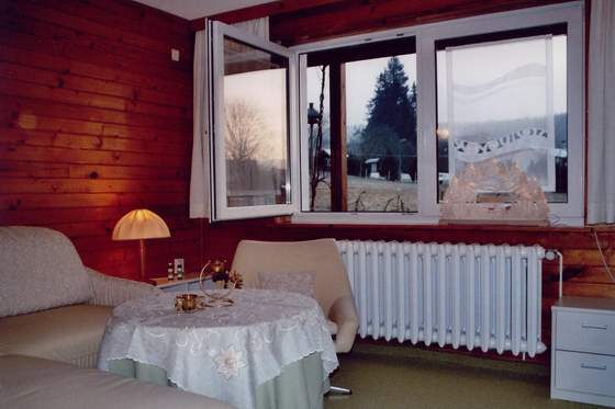 Kaminzimmer. Das Kaminzimmer ist gut als Frühstücksraum geeignet. Am offenen gut ziehenden und gut heizenden Kamin kann man gemütliche Abendstunden verbringen. Die gesamte Wohnung ist jedoch außerdem mit Warmwasser- Zentralheizung ausgerüstet, und in den meisten Räumen befindet sich zusätzlich eine Fußbodenheizung, so dass bei uns noch niemand gefroren hat. Die Eckbank im Kaminzimmer besteht aus zwei Betten, nach Entfernen der Polster können zwei weitere Schlafmöglichkeiten geschaffen werden. Im Kaminzimmer befindet sich eine Radioanlage mit CD-Spieler und Kassettenteil. Vom Kaminzimmer gelangt man durch eineTerrassentür