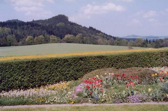 Von der überdachten Terrasse nach Norden hat man einen weiten Ausblick über Wiesen und Felder auf weitere Berge der Sächsischen Schweiz.