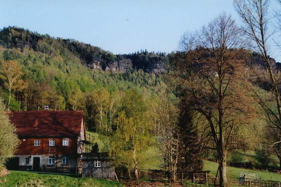 Gut beschreibt auch der Blick vom Kleinen Zschirnstein nach NO die Lage des Hauses, das auf diesem folgenden Bild am linken Bildrand zu sehen ist.